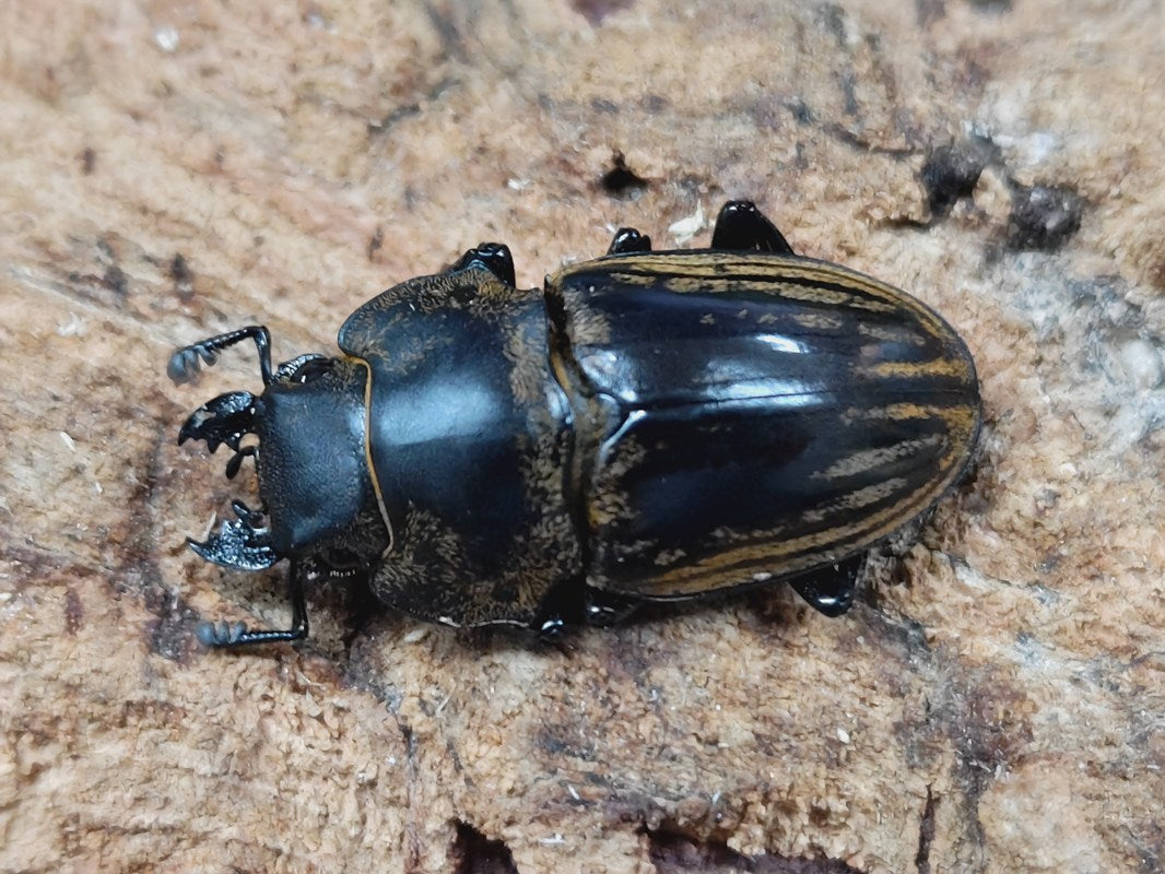 ツヤクワガタの中でも小型の種類で、金褐色の微毛がストライプ状に生えているのが特徴。